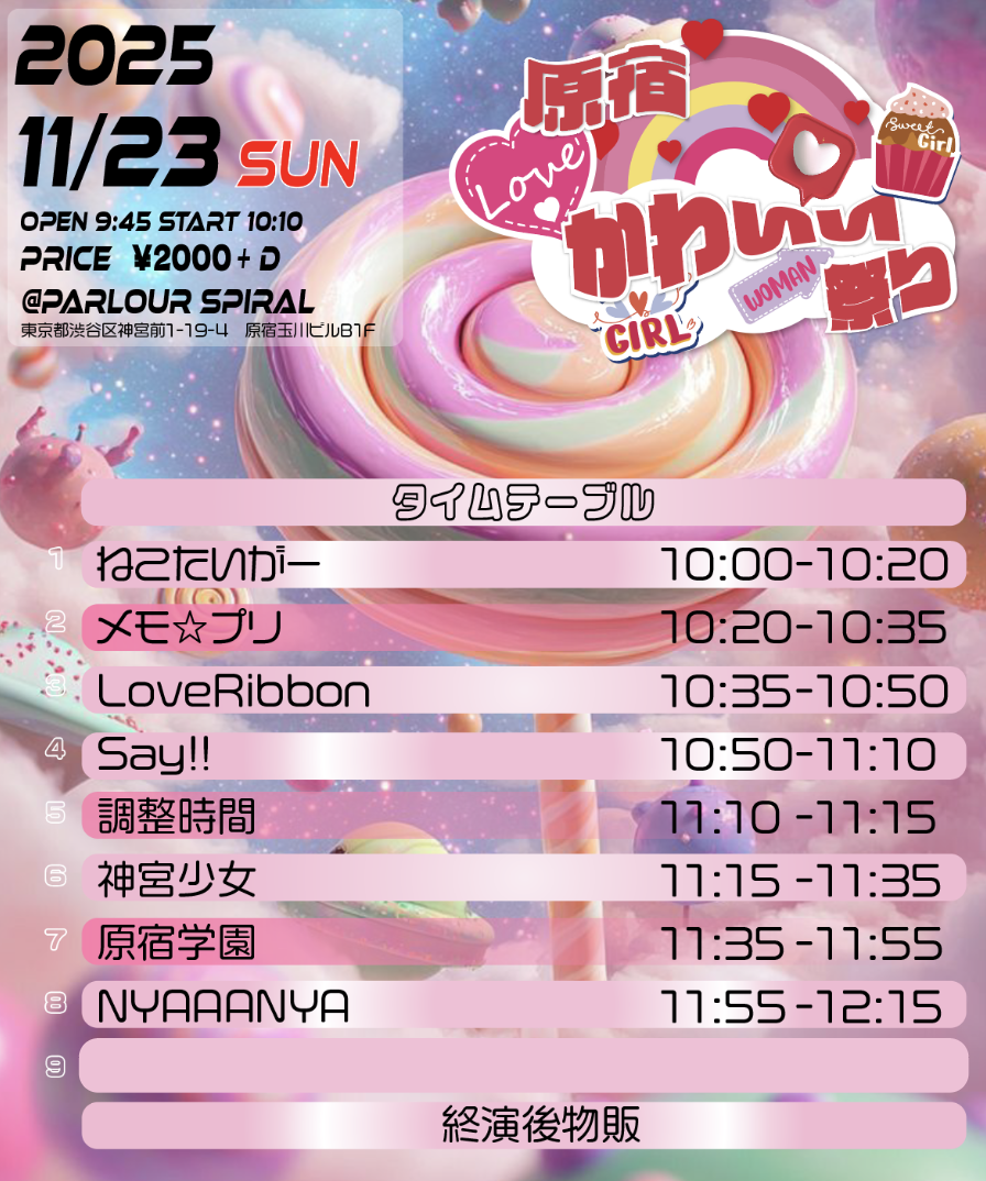 | 出演 | 原宿学園 NYAAANYA ねこたいがー 神宮少女 LoveRibbon、メモ☆プリ |