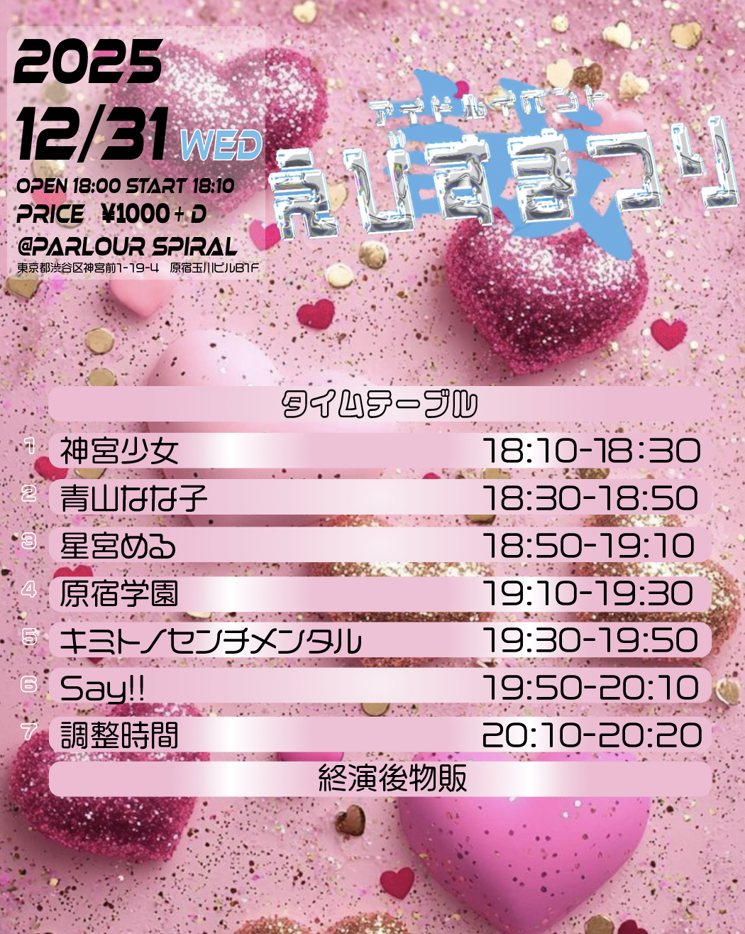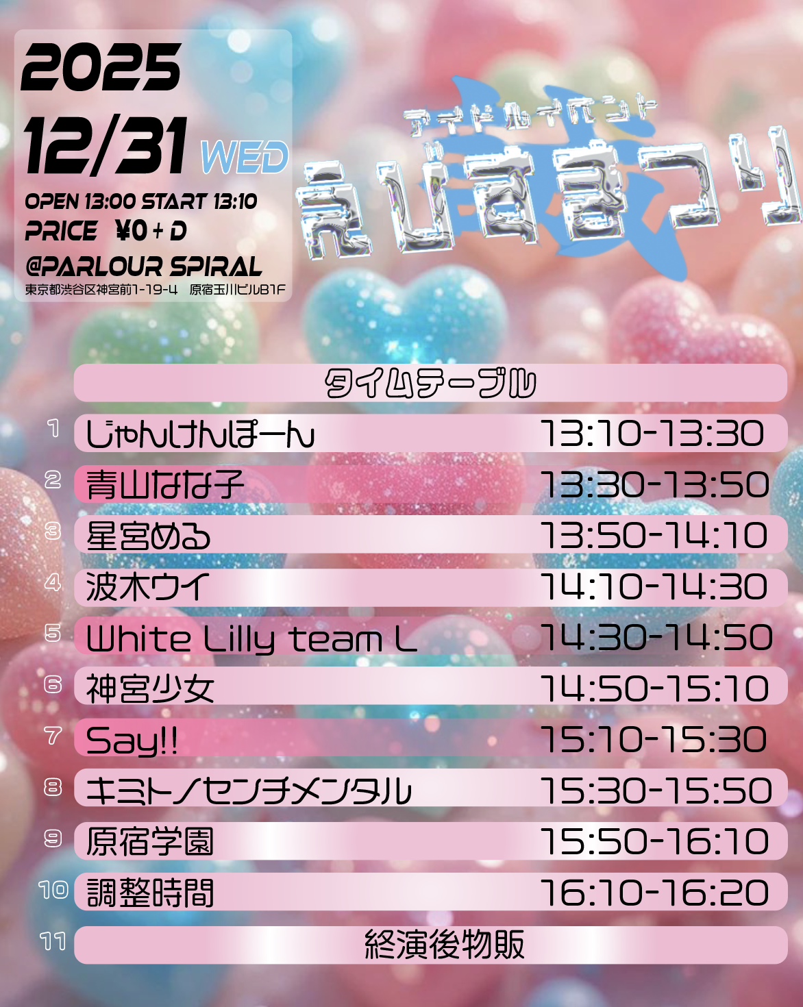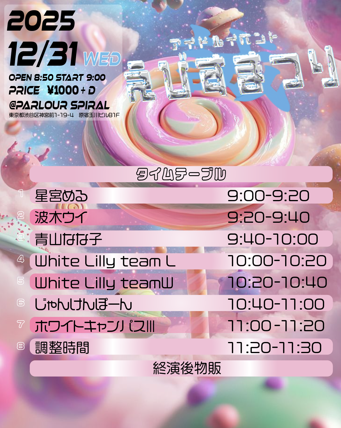 | 出演 | SPIRALMUSIC参加チーム→じゃんけんぽーん/青山なな子/神宮少女/Say!!/原宿学園/青山はるか(予定) |