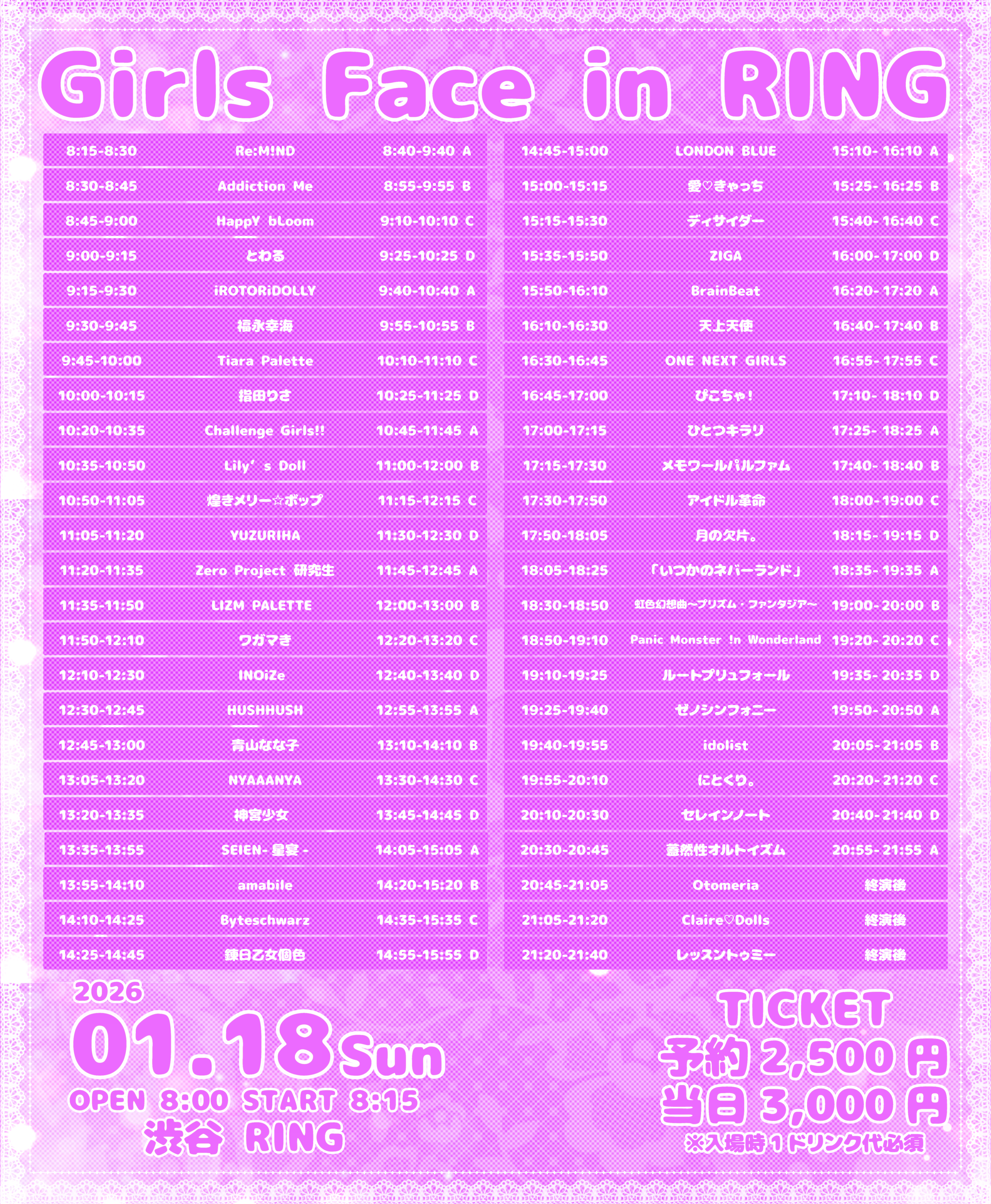 Panic Monster !n Wonderland / 「いつかのネバーランド」 / アイドル革命 / にとくり。 / 蓋然性オルトイズム / INOiZe↯ / 錬日乙女個色 / ルートプリュフォール / ゼノシンフォニー / ぴこちゃ! / YUZURIHA / レッスントゥミー / iROTORiDOLLY / Re:M!ND / セレインノート / SEIEN-星宴- / Otomeria / +idolist / Tiara Palette / LIZM PALETTE / 虹色幻想曲〜プリズム・ファンタジア〜 / ワガマき / Challenge Girls!! / BrainBeat / 煌きメリー☆ボップ / ひとつキラリ / メモワールパルファム / amabile / 天上天使 / 月の欠片。 / ZIGA / ディサイダー / Byteschwarz / ONE NEXT GIRLS / Addiction Me / HUSHHUSH / LONDON BLUE / Claire♡Dolls / 神宮少女 / NYAAANYA / Zero Project 研究生 / とわる / 愛♡きゃっち / HappY bLoom / 福永幸海 / 指田りさ / 青山なな子